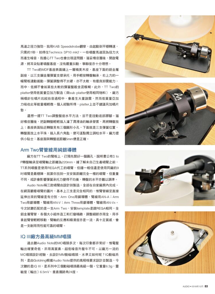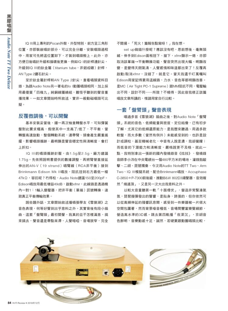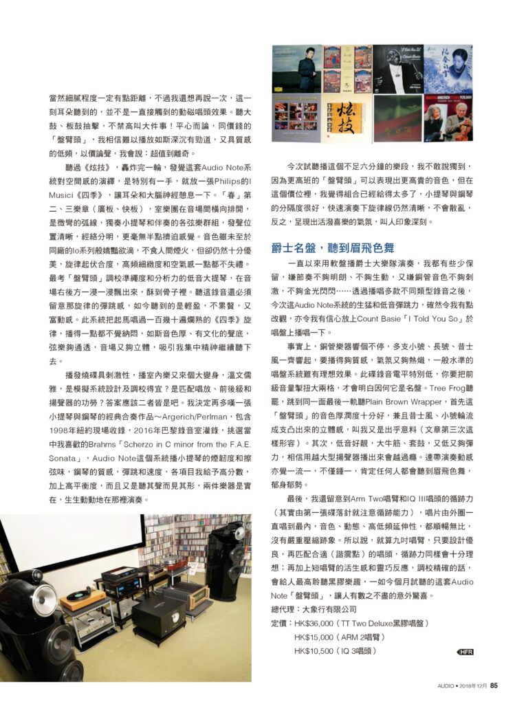 “The Audio Note [IQ3] cartridge, [Arm 2] tonearm and turntable system hit high scores when playing the elastic and sweeping sounds of the violin, along with the texture, staccato notes and tempo of the piano.”