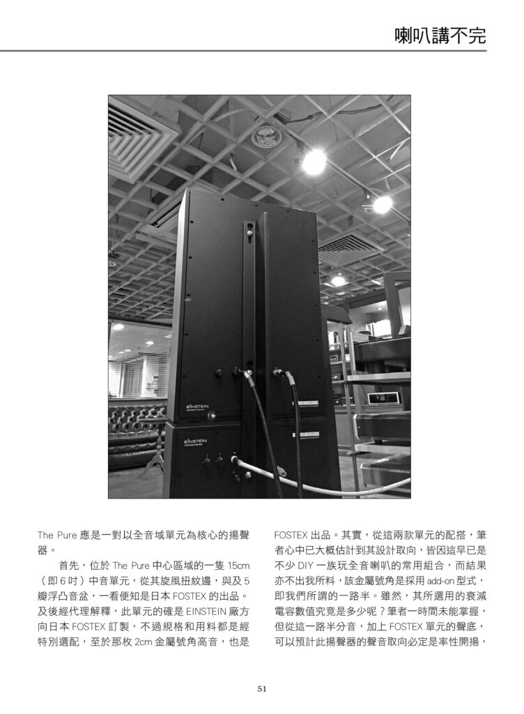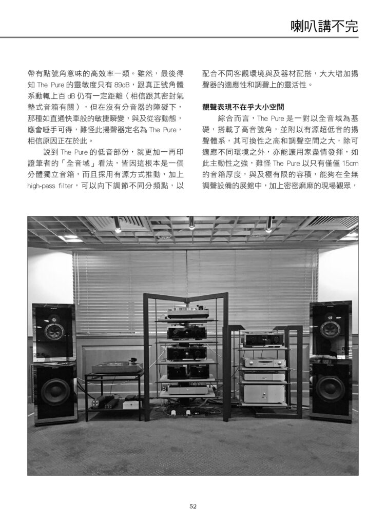 “Without a crossover in its way, its agile response to split-second changes is as quick as an express train, and its dynamic looseness wins hands down. No wonder this speaker is named The Pure⋯⋯ All in all, The Pure is a speaker system that covers the full-range, equipped both with a high-pitched horn and an active subwoofer. Its high interchangeability and large tuning space make it adaptable to different environments, and allows users to use it as they please.”