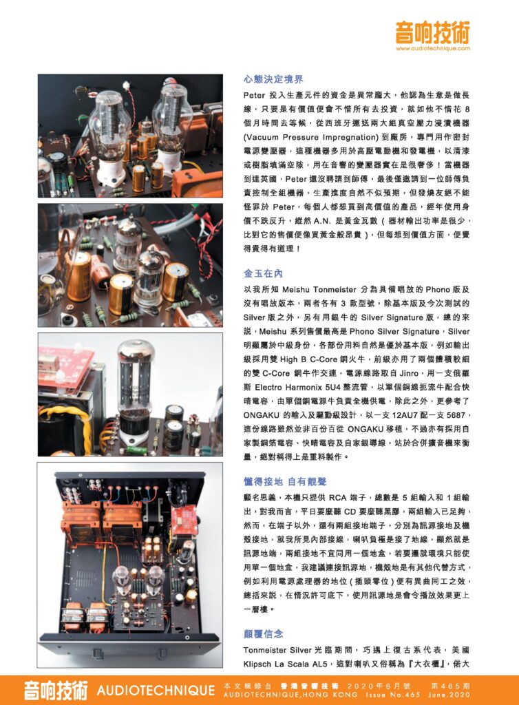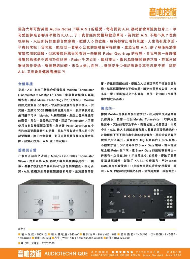 “Once you go with a vacuum tube amplifier, you are on the path of no return. Should you choose AN, you will never turn back! Just as what the Meishu Line 300B Tonmeister Silver gives me is not an impulsive addiction. Its allure is that it makes you forget the time… As Peter puts it earnestly, ‘I am convinced that the only way to make good equipment is by investing money in its components. I never boast about how great my equipment sounds; we only rely on our technical knowledge and having good materials. As long as you make every part well, that is enough!’.”