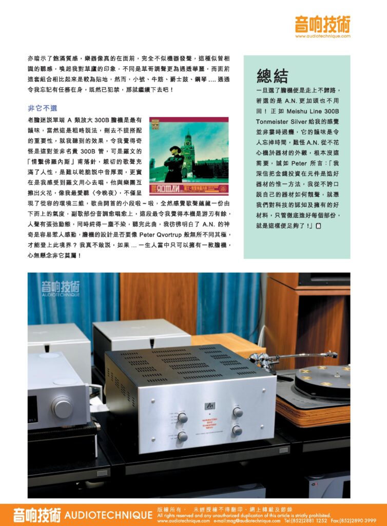 “The single-ended Class A 300B amplifier is most alluring. ⋯⋯ As soon as the needle drops on Roman Tam’s “Love Lingers in Voronezh” [performed with the Voronezh State Symphony Orchestra], the intimate vocals are full of humanity, or to put it simply, his alto voice is thick and mellow. Moreover, I felt that Roman Tam sang with his heart, and that sparks flew between him and the orchestra… This machine is more than enough to handle the task, emanating vocals that are both relaxed and dynamic, while staying pure and spotless. After listening to this song, I came to understand how easily the magic of AN moves people. ”